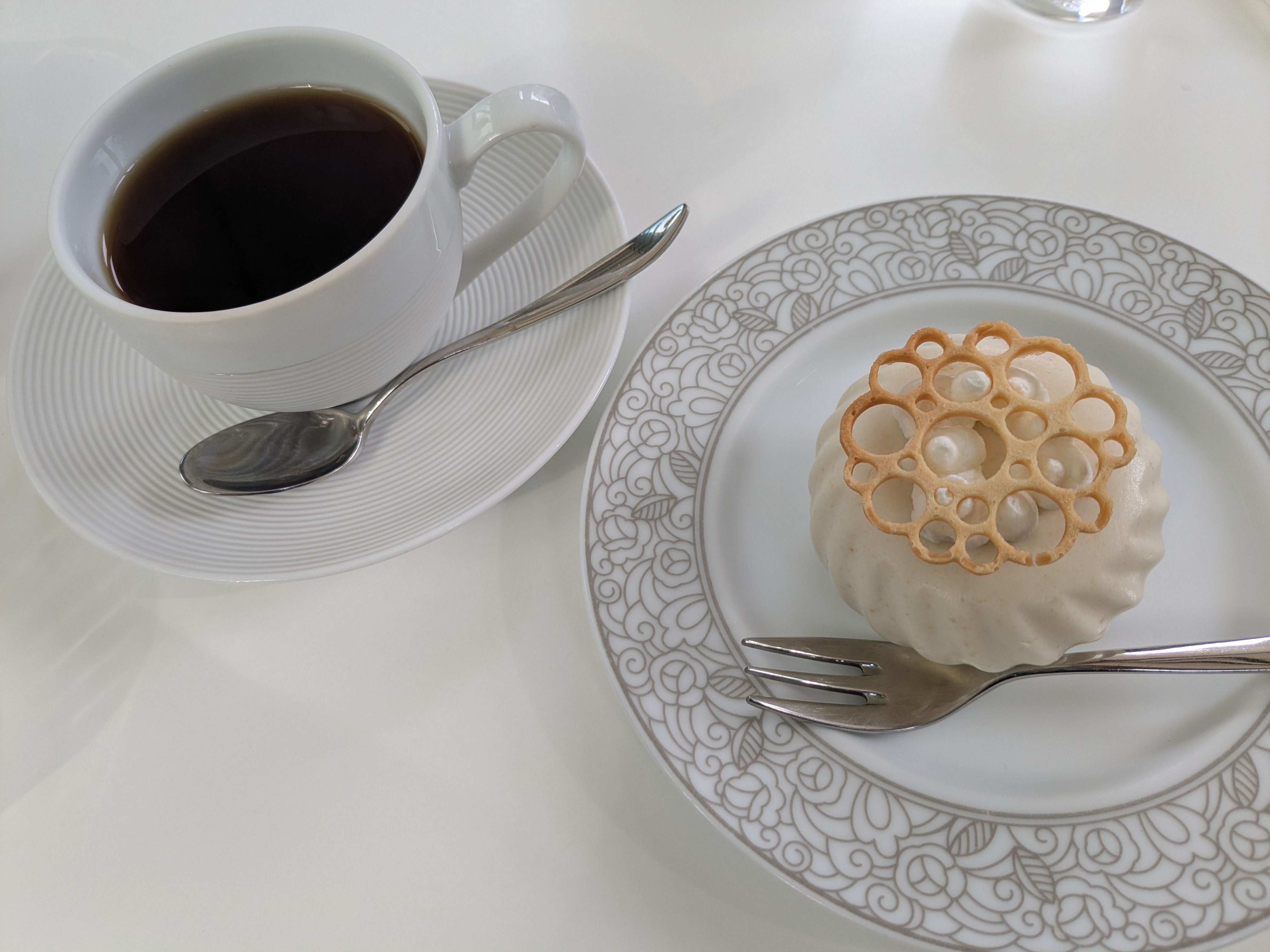 「香水塔」の名前で親しまれている香水噴霧装置を象ったケーキをいただき、金木犀の香る庭を眺めながら贅沢な時間を過ごしました。